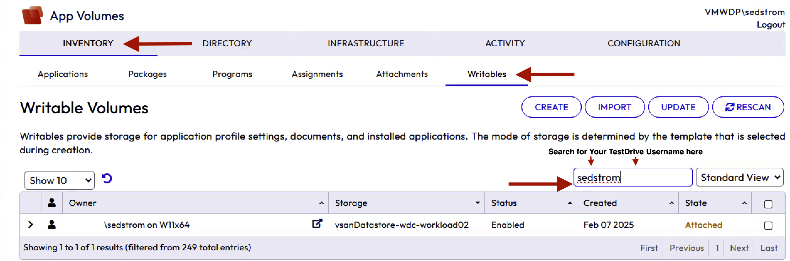 - Search for your username to filter out your Writable volume
