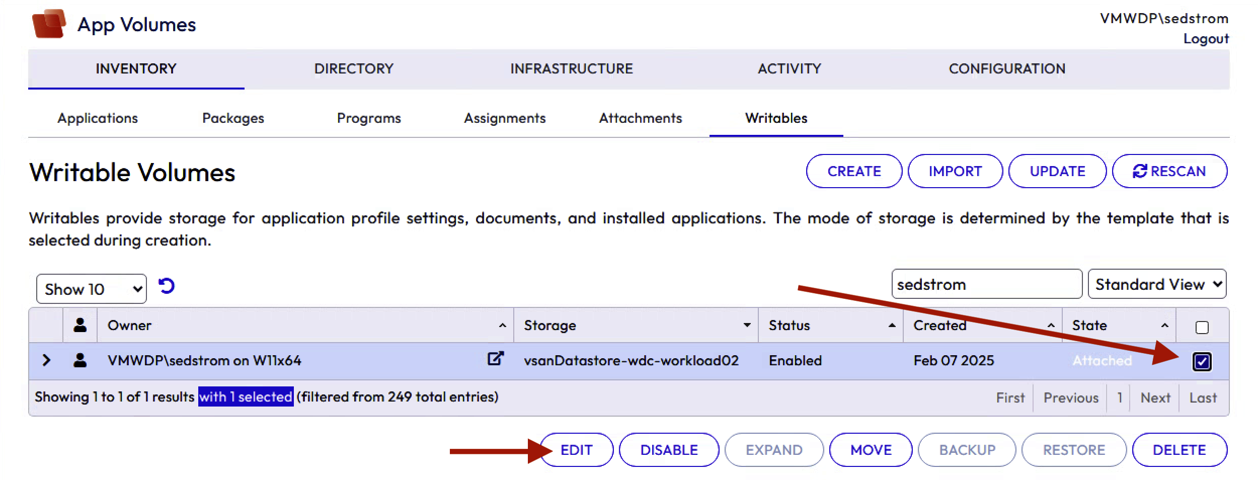 Tick the box next to your Writable Volume and select "Edit"