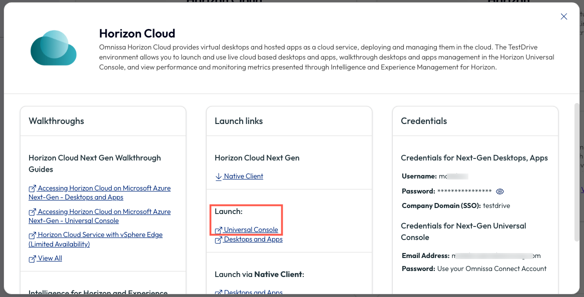 If you need to locate your TestDrive credentials, go back to the TestDrive Portal testdrive.omnissa.com > DemoZone > click on View Details within the Workspace ONE Intelligent Hub tile.