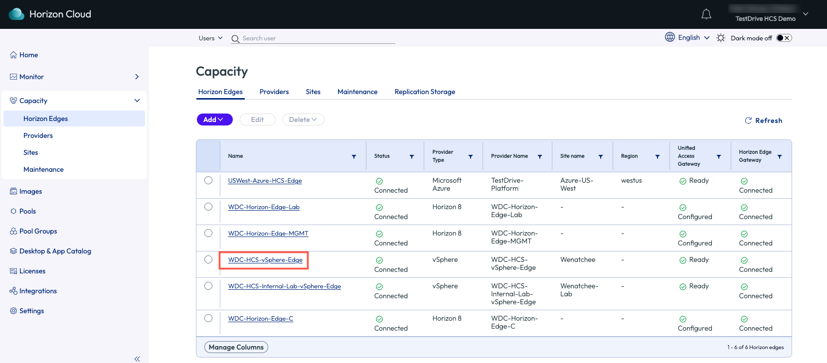 In the Horizon Edges page, find the Horizon Edge named WDC-HCS-vSphere-Edge and click on it.