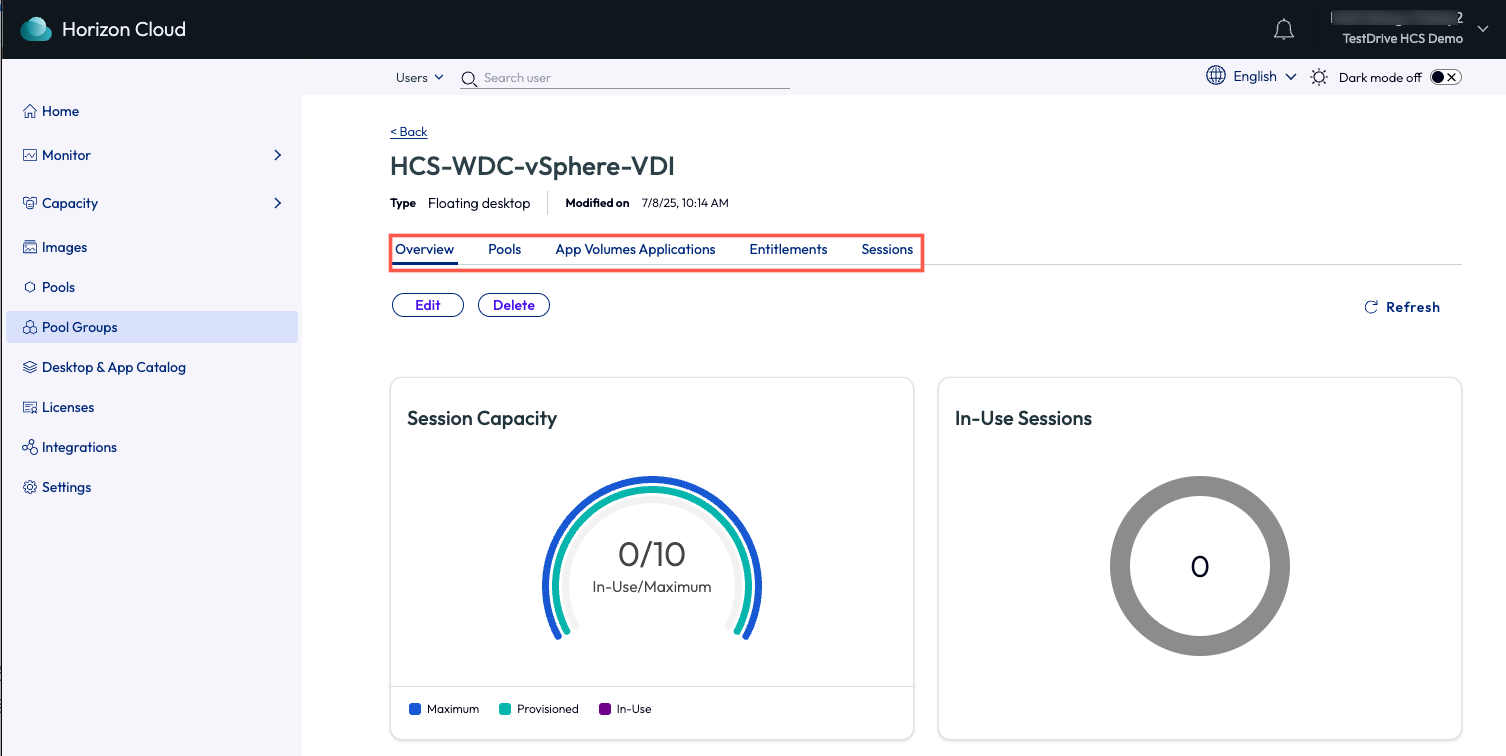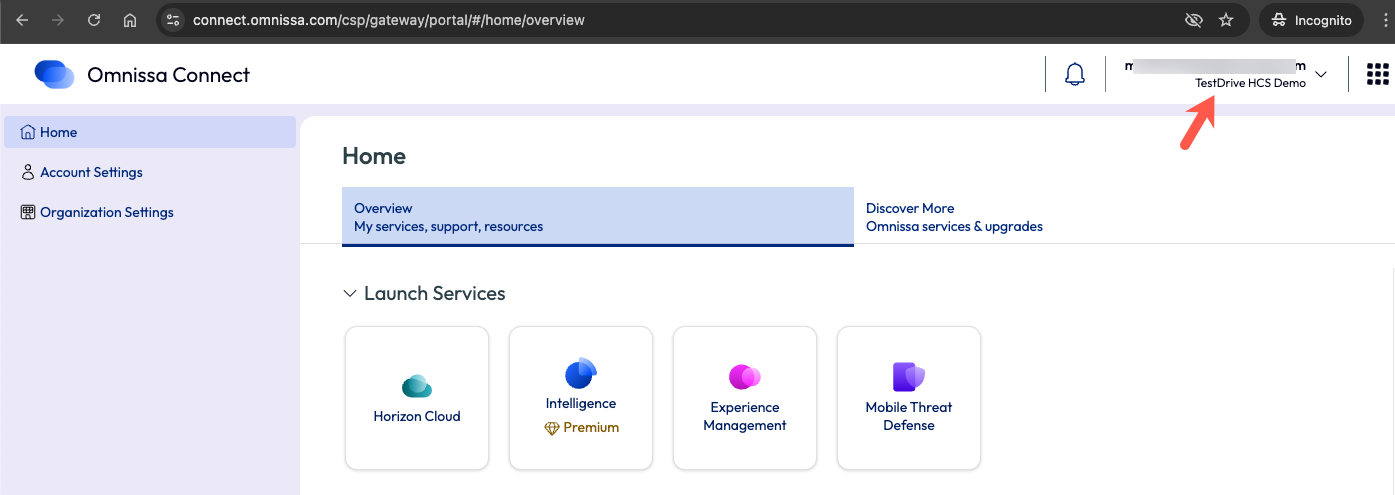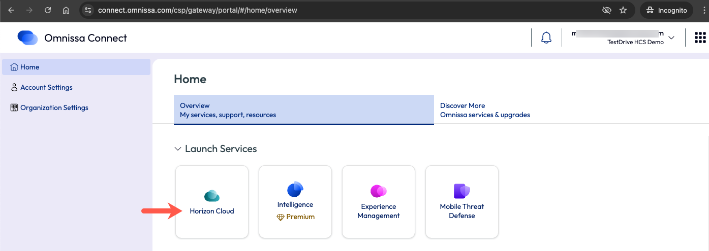 For TestDrive Horizon Cloud Next-Gen, make sure you are in the correct organization named "TestDrive HCS Demo".