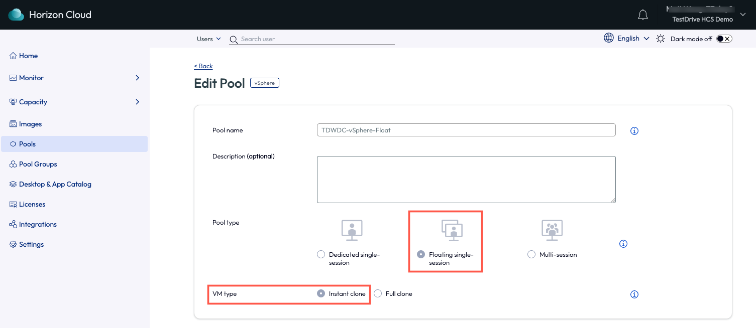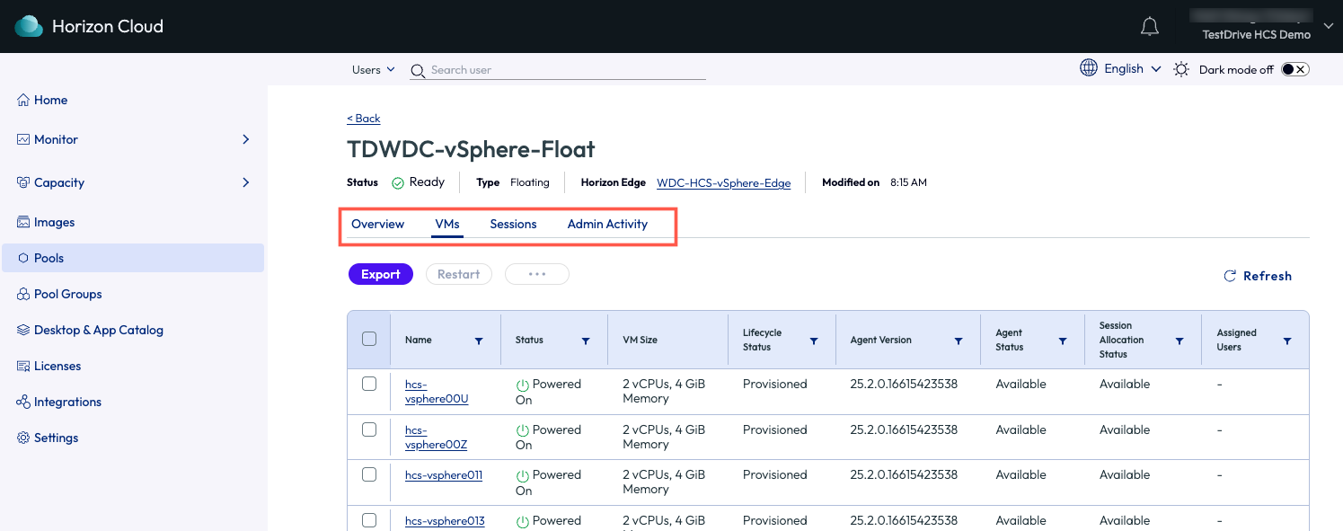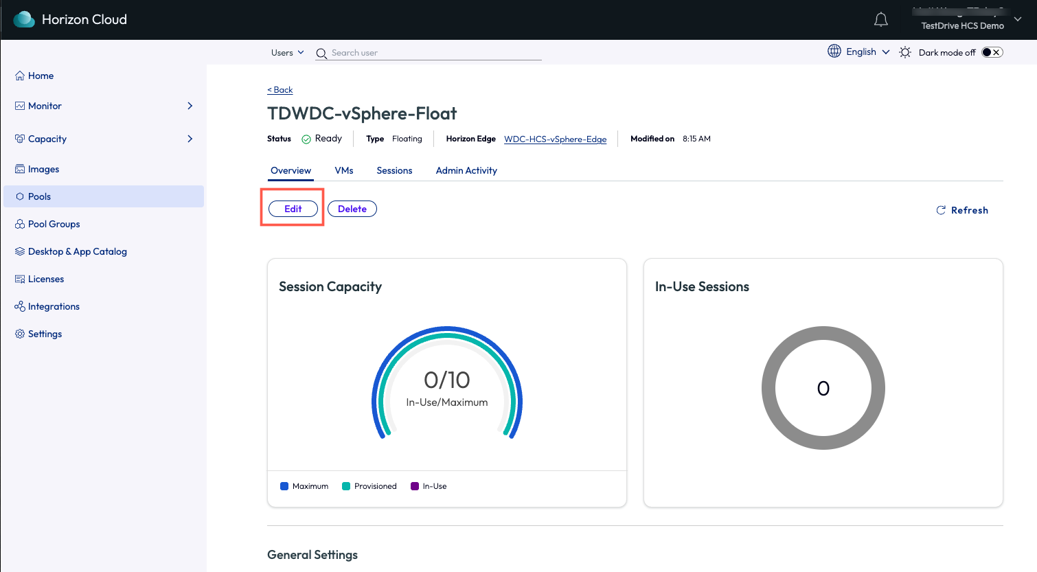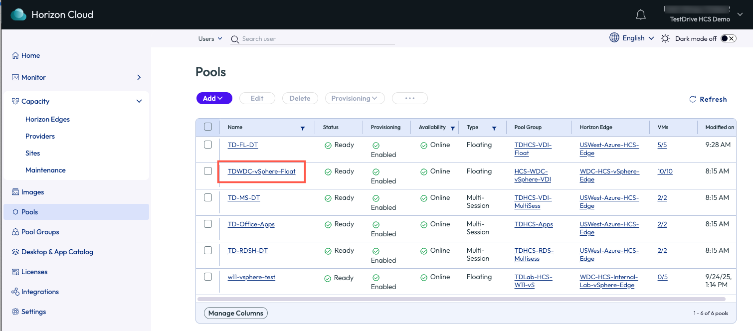 In the Horizon Cloud console, go to Pools, then find and click on the pool named TDWDC-vSphere-Float.