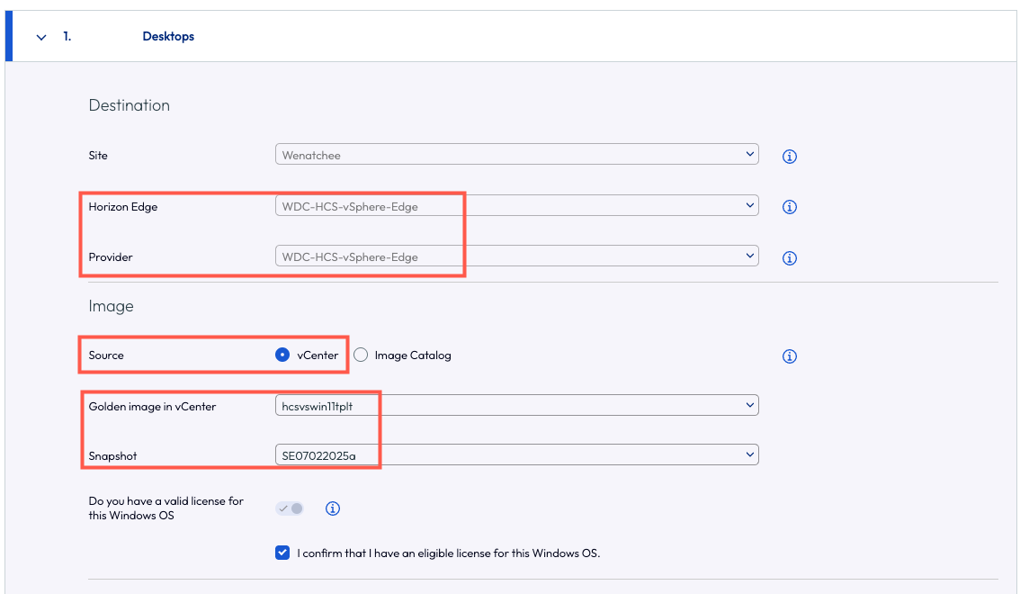 Scroll down to the Desktops section and notice the Horizon Edge and Provider fields match the same name of the Edge that was displayed earlier in the Capacity section.