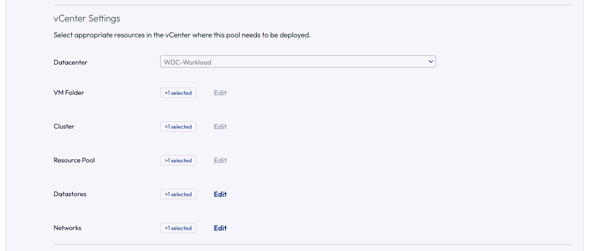 Scroll down to the vCenter Settings section and notice that similar to deploying a pool with Horizon 8 on vSphere, we selected appropriate vCenter related settings.