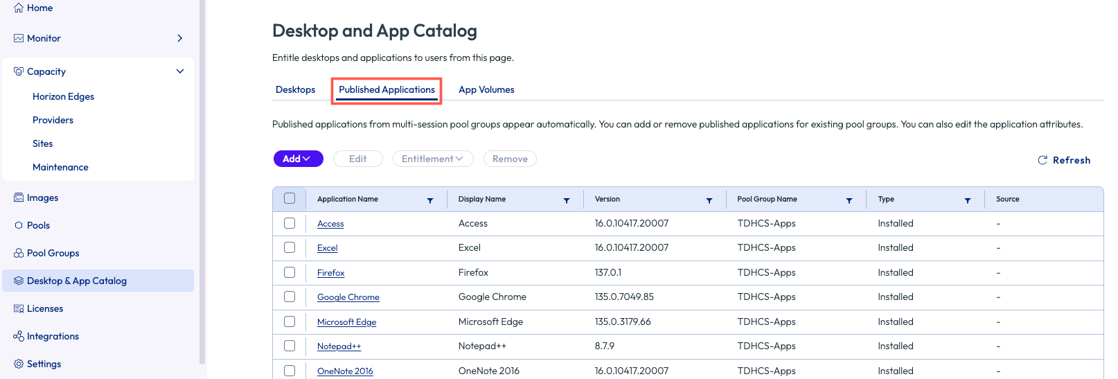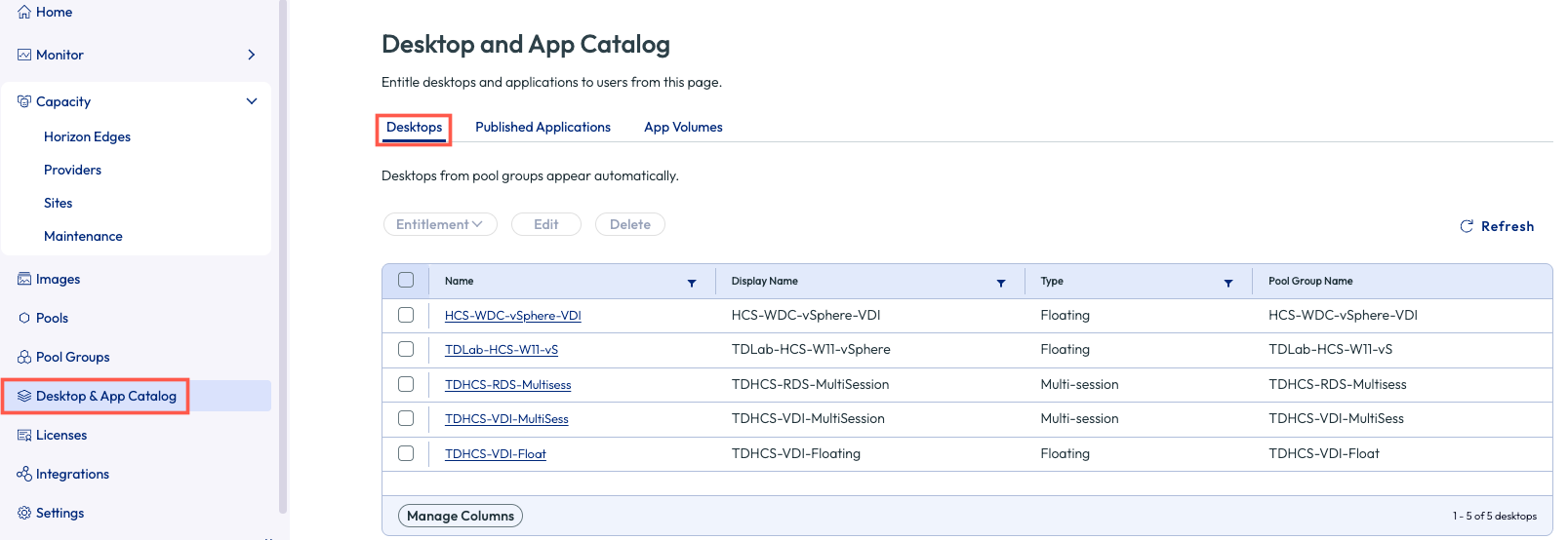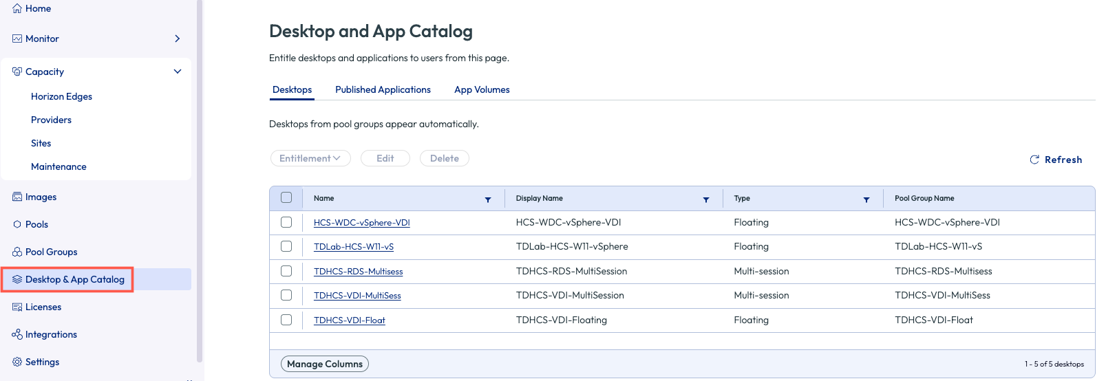 Click on the next section called Desktop & App Catalog, which is broken down into 3 columns, Desktops, Published Applications and App Volumes.
