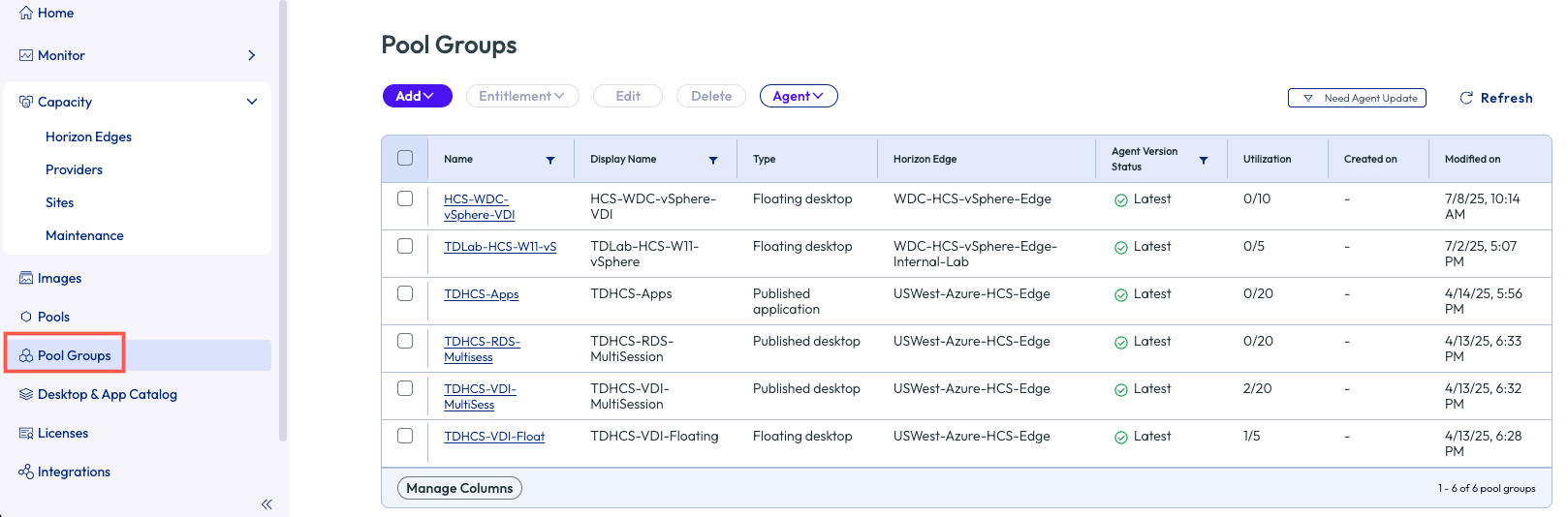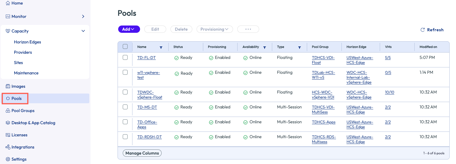 Under Horizon Edges, you can see that multiple edges have been deployed for Microsoft Azure, Horizon 8, and vSphere cloud deployments.