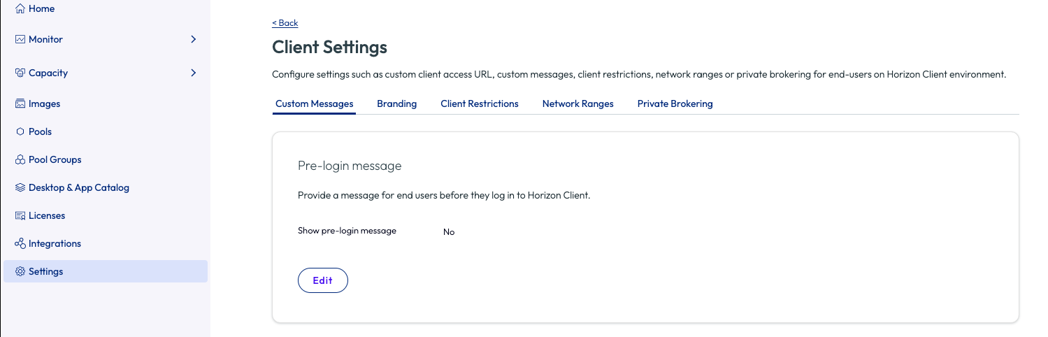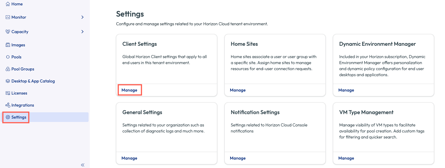 The Settings menu is where we manage various settings such as Client Settings, Home Sitesand Dynamic Environment Manager configurations.