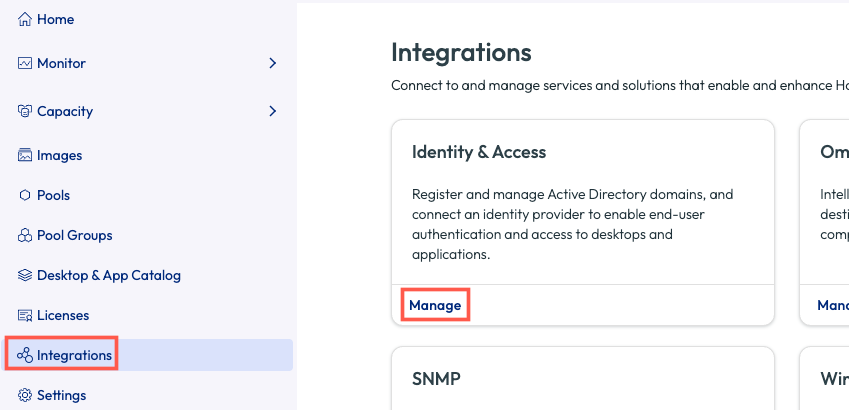 Now click on the Integrations menu, and under Identity & Access select Manage.