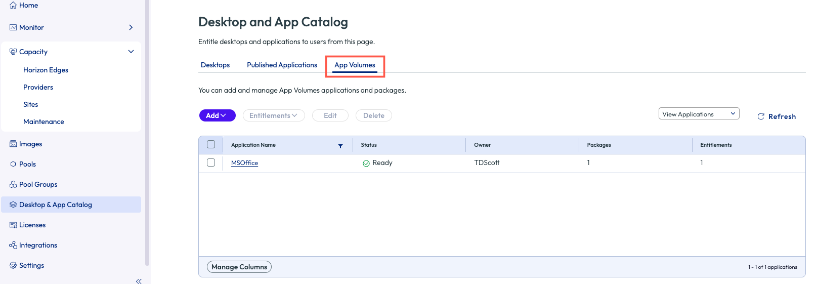 TheApp Volumes column is where applications previously captured and applied are viewed and managed.
