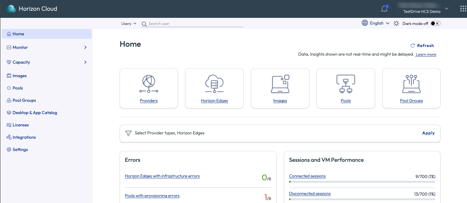 For TestDrive Horizon Cloud Next-Gen, make sure you are in the correct organization named "TestDrive HCS Demo".