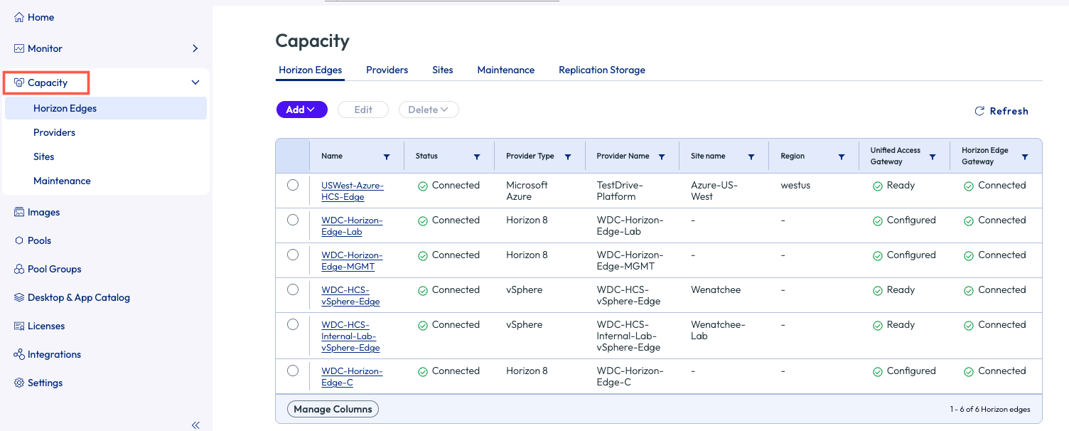 TheCapacitymenu lists theHorizon Edges, Providers, Sites and Maintenanceinformation.