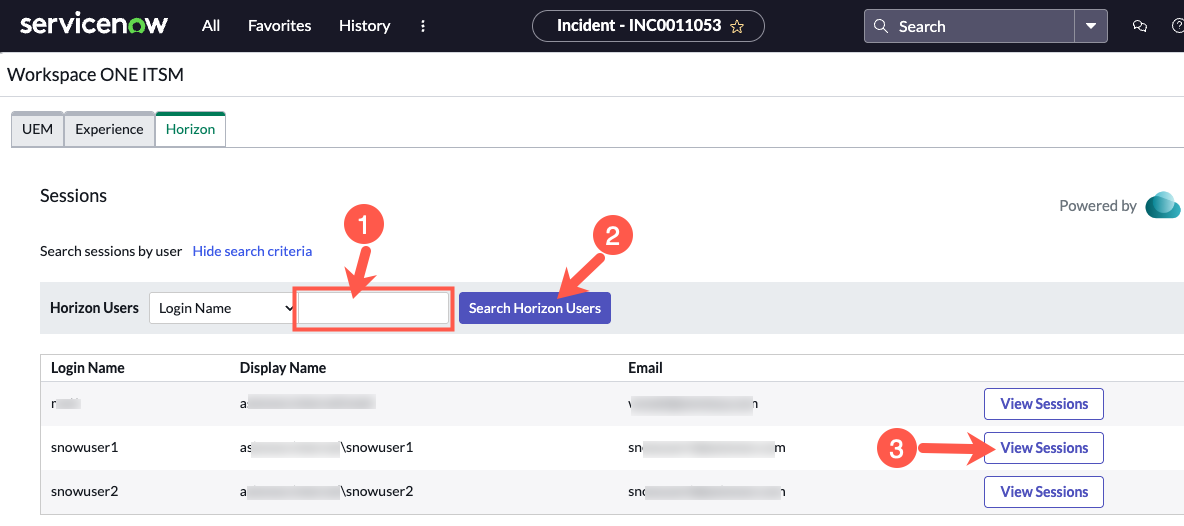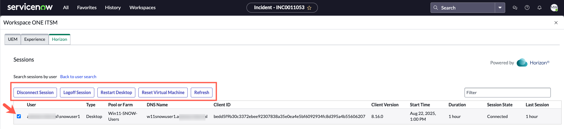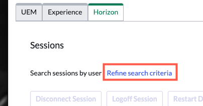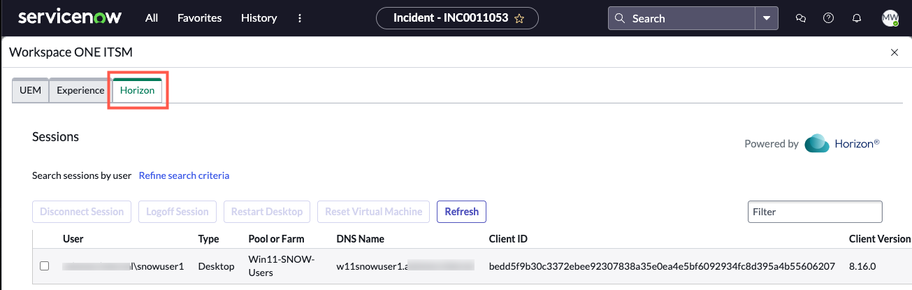 - Search for Horizon user sessions with the Workspace ONE ITSM Connector.