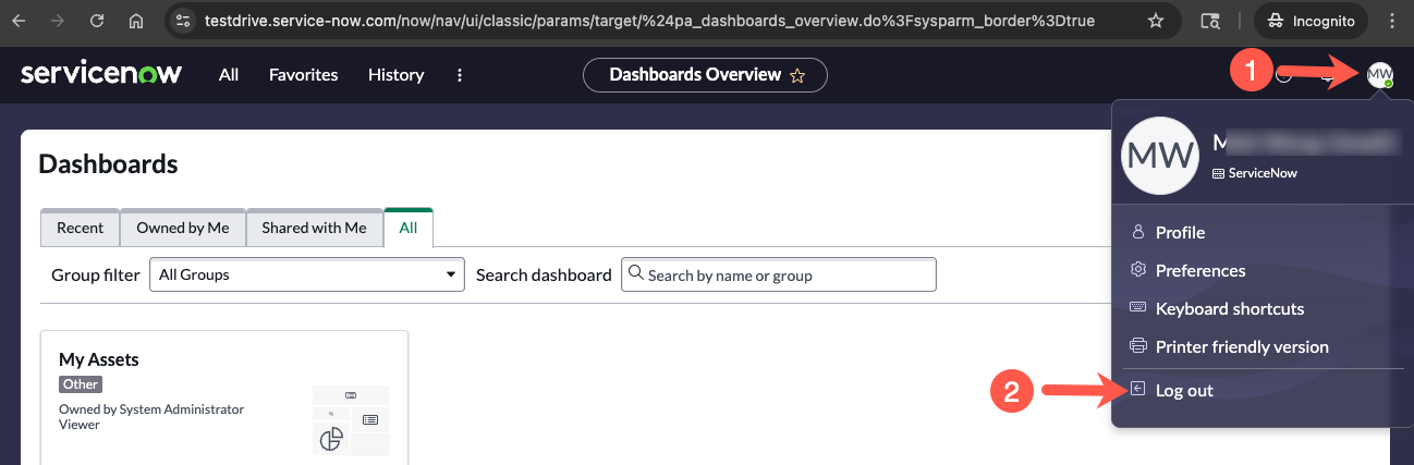 If this is your very first time accessing this ServiceNow instance, you will need Log out from ServiceNow and then log back in (using the same web app in Workspace ONE Intellgent Hub) to have your appropriate roles applied. You can skip this Log out step if you have previously logged in to this Service Now instance.