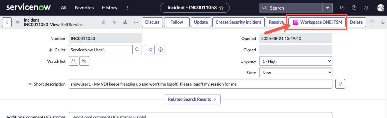 After opening one of the incident tickets, click on the Workspace ONE ITSM button.