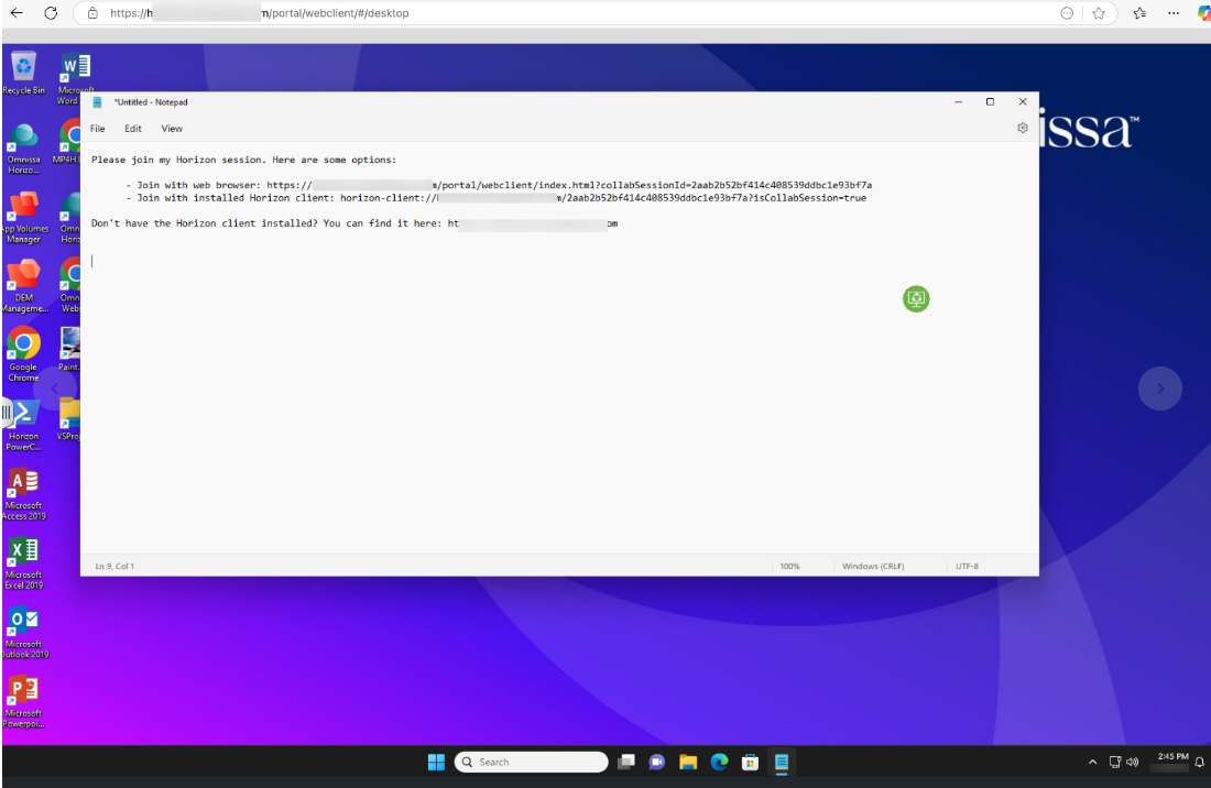 Start the Notepad app within the VDI desktop, then paste the invitation that was copied to the clipboard.