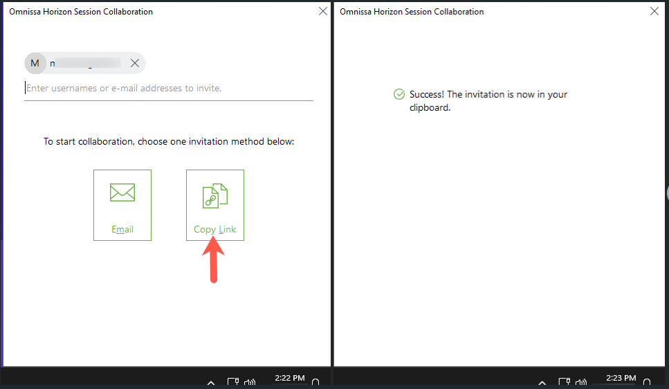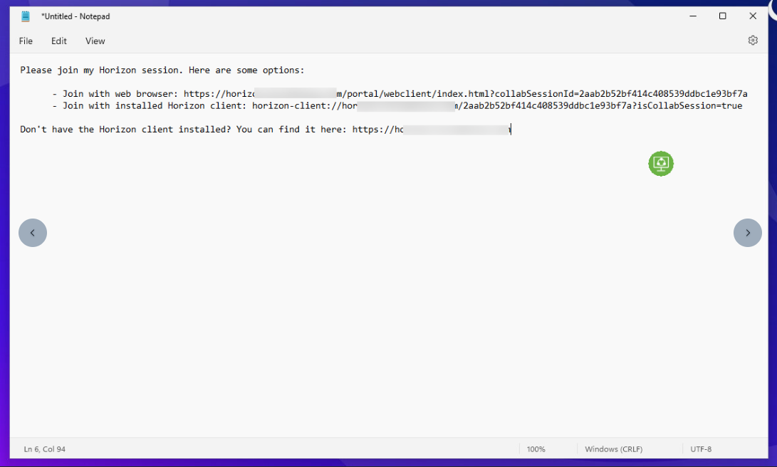 Your collaborator can join your Session Collaboration by using either a web browser or Horizon Client. From the invitation you pasted into Notepad, select and copy either the URL (web browser using https://) or URI (Horizon Client using vmware-view://) link to the clipboard of your local client machine, then provide the link to your collaborator.