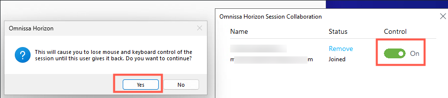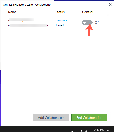 To give control of the desktop to your collaborator, open Session Collaboration from the system tray, then click on the Control toggle.