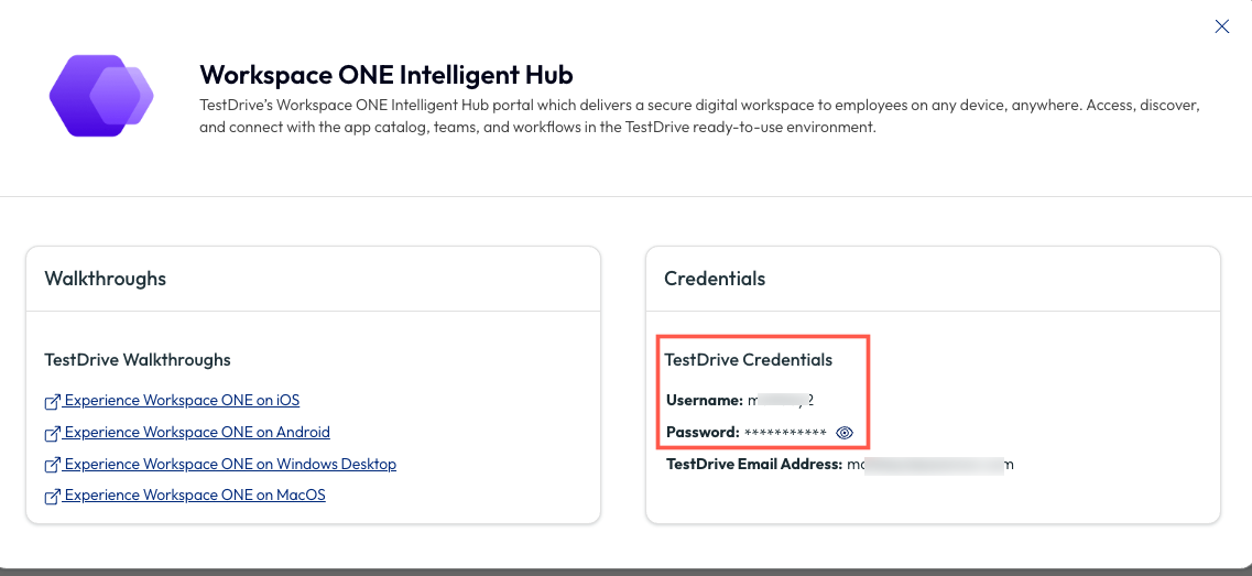 In the Workspace ONE Intelligence Hub Details pop up window, take note of your TestDrive Credentials.
