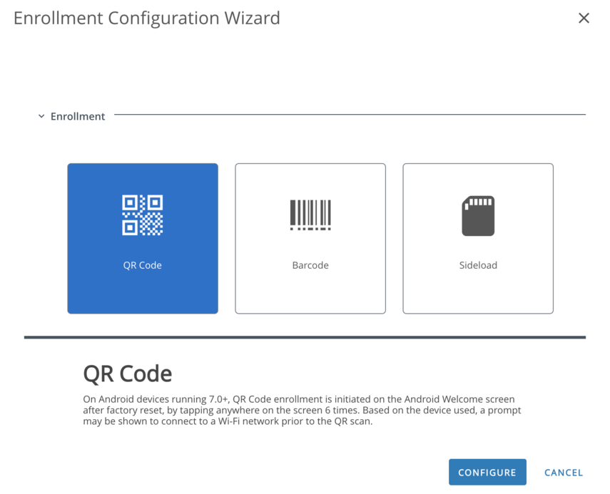 The preferred and simplest Android rugged device enrollment method is QR code. QR code enrollment is expected enrollment method in this guide. Other enrollment methods are described below, but only for review.