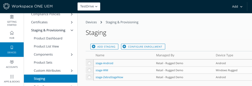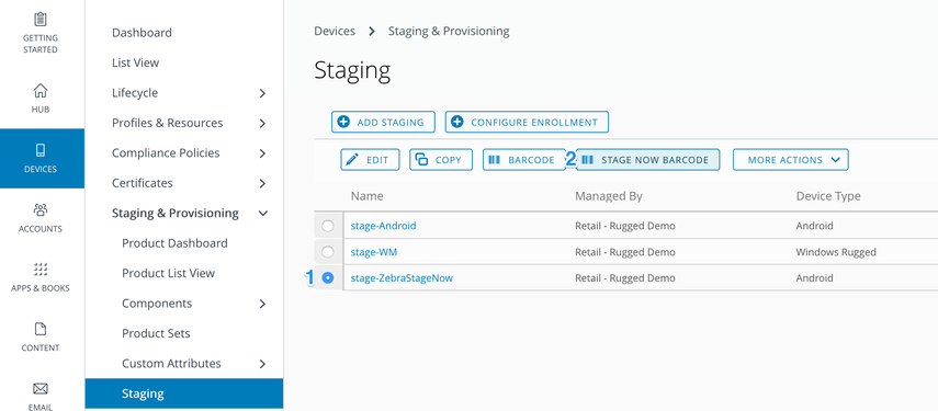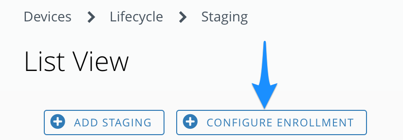The Enrollment Configuration Wizard (Devices > Lifecycle > Staging > Configure Enrollment) is a staging wizard which guides the new rugged admin through the entire staging setup, taking the guesswork out of what's required to set up staging, freeing up time to get more devices into production.
