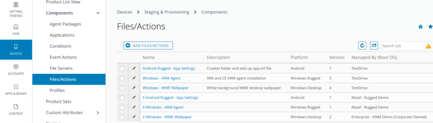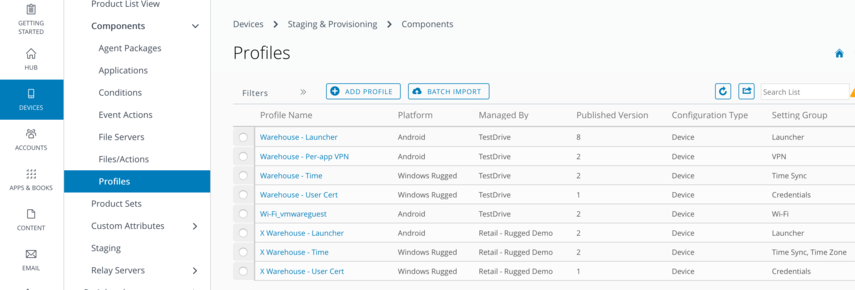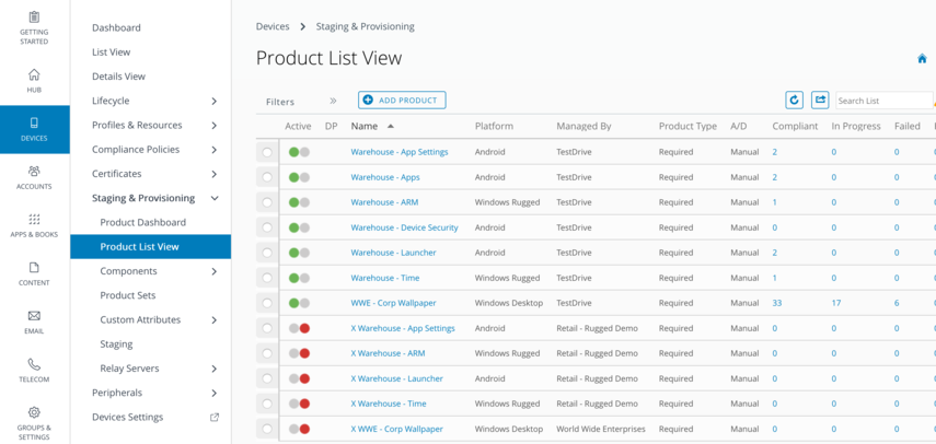 Staging & Provisioning is the home of product provisioning and is where you to set up components, such as profiles, applications, and files/actions, which manage rugged devices. The components are bundled together in products, which are pushed to devices. These products follow a set of rules, schedules, and dependencies as guidelines for ensuring your devices remain up to date with the content they need.