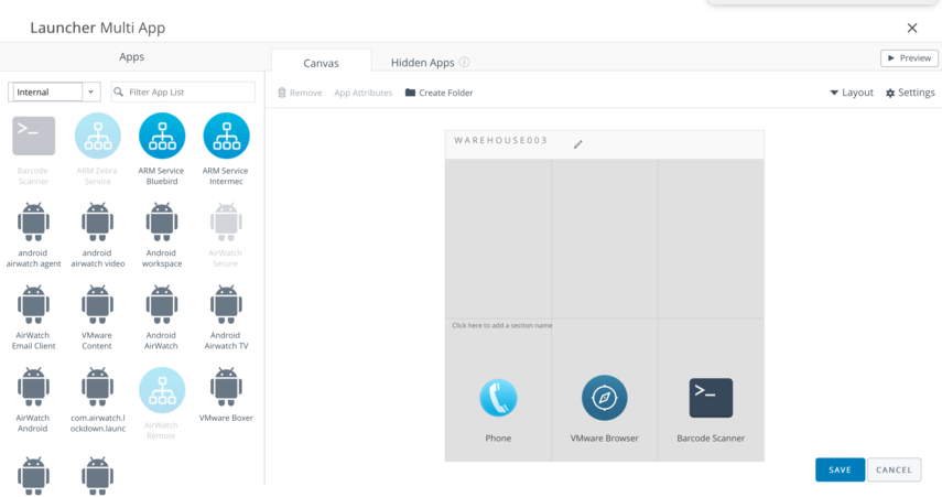 Demonstrating a common rugged use case, the enrolled the device will be provisioned with a passcode, a few apps, and locked down with the Launcher. The Launcher provides access to a few apps, but restricts access to the rest of the device. The device can be remotely assisted via Workspace ONE Assist.