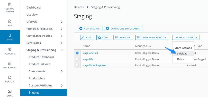 Select the pre-configured stage-Android profile > More Actions > Sideload.