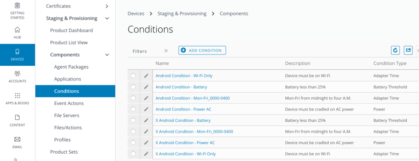 - Conditions enable you to set products to download and install on your device only when preset conditions are met. When enabled, conditions must be met on the device before performing a deployment action