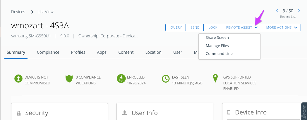 In device details, activate Assist through the top menu bar REMOTE ASSIST function. Choose "Share Screen" for the initial remote view level of access.