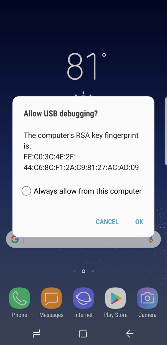 On the device, hit OK when prompted to allow grant permission to allow USB debugging. Select to always allow from this computer to skip this step on this device in the future.