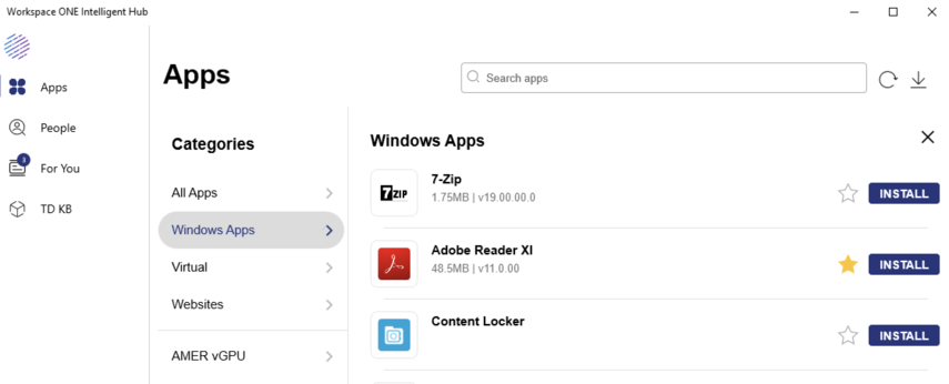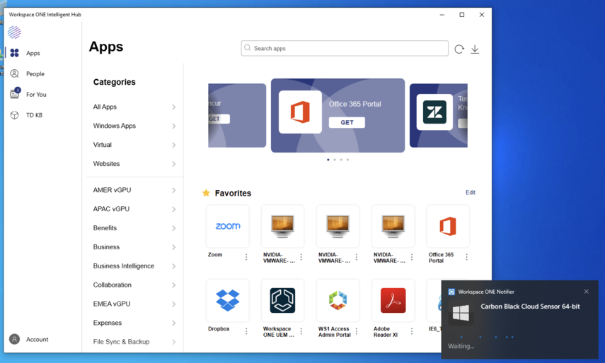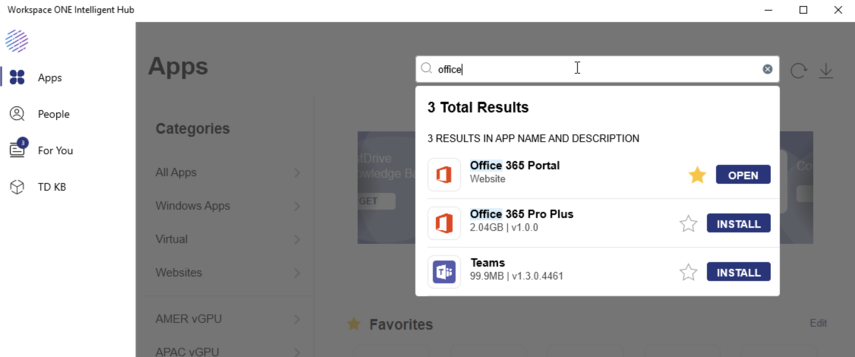In Intelligent Hub, note the Apps, People, For You, and customizable site (TD KB) areas. In Apps, review both the Categories, making note of all apps: Windows, virtual, and web. Note the ability to mark apps as favorites for quick access.