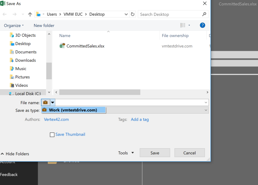 In Excel, save the document to your desktop. Note how the file can only be saved as a "Work" document type for the protected domain.