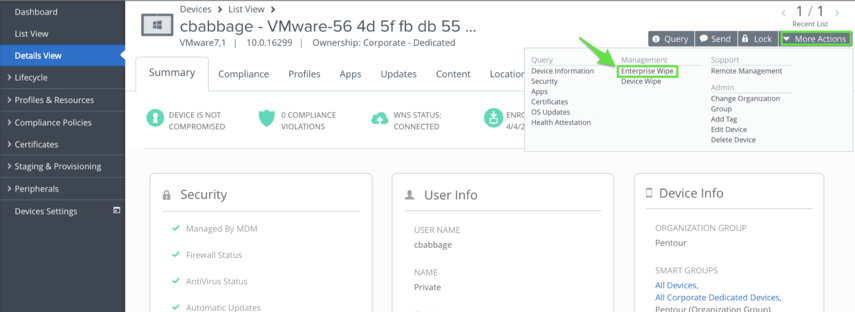 An enterprise wipe removes all data and access provided by Workspace ONE. An enterprise wipe may be either manually performed by an admin, if allowed, by a user, or may be configured to be triggered via compliance policy.