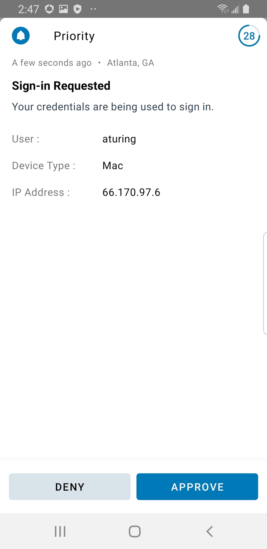 The priority notification provides the sign-in request's user, device, and IP information.