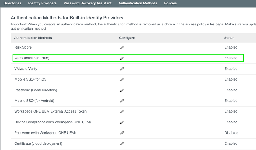 An admin configures the Verify (Intelligent Hub) authentication method in Workspace ONE Access.