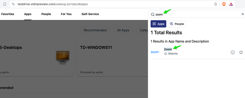If you can't find the Zoom web app in Workspace ONE, most likely Zoom has not been enabled on your TestDrive account. Log in to the TestDrive portal, go to Sample Integrations > enable Zoom.