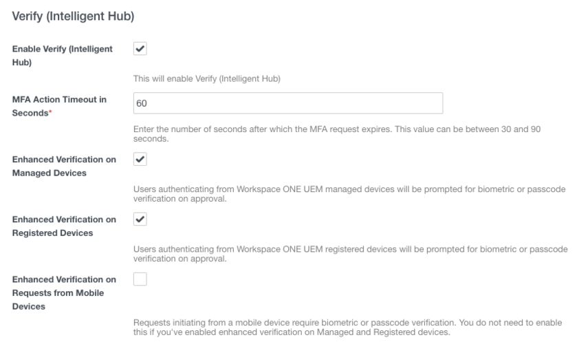 - The Verify Intelligent Hub authentication method works on devices both registered and enrolled using the Intelligent Hub. Therefore, all Workspace ONE Intelligent Hub users—regardless of their device management type—can utilize MFA in the Intelligent Hub.