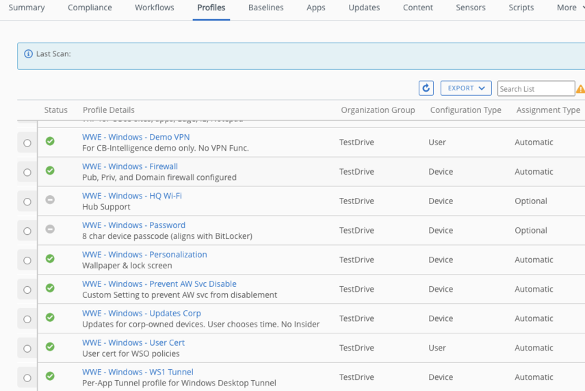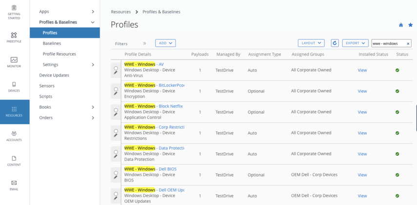 In "Search List," enter "WWE - Windows -" to quickly filter your view to only list Windows 10/Windows 11 profiles.