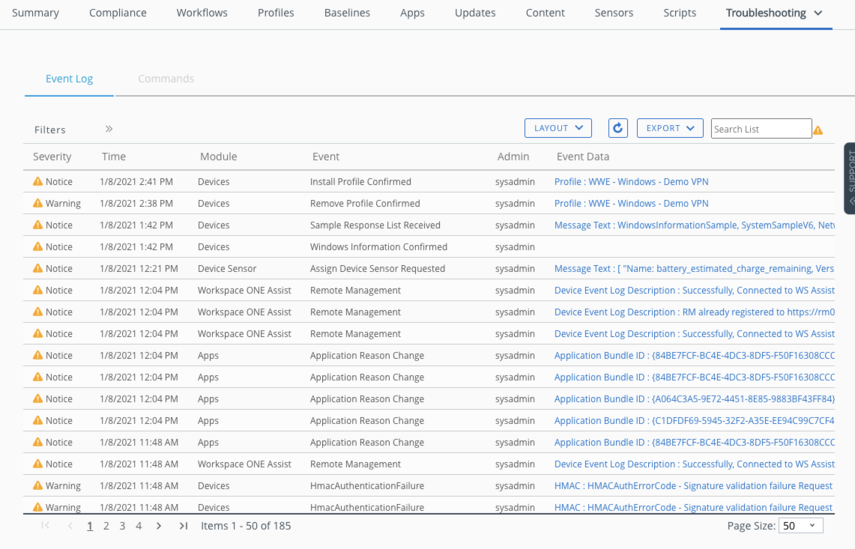 Discuss how Workspace ONE UEM enables the administrator to see real-time event logs—just as one would with SCCM—right in the Workspace ONE UEM console. Both events and command statuses can be readily accessed in real time!