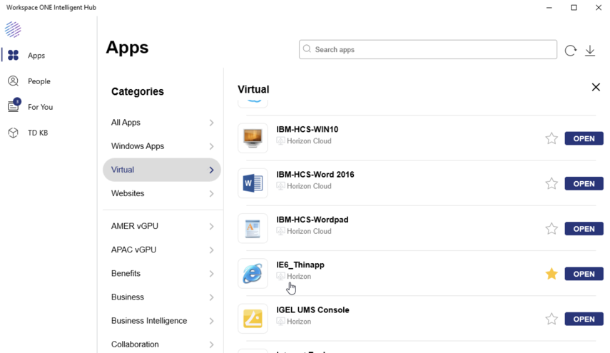 In Apps, review both the Categories, making note of all apps: Windows, virtual, and web. Note the ability to mark apps as favorites for quick access.