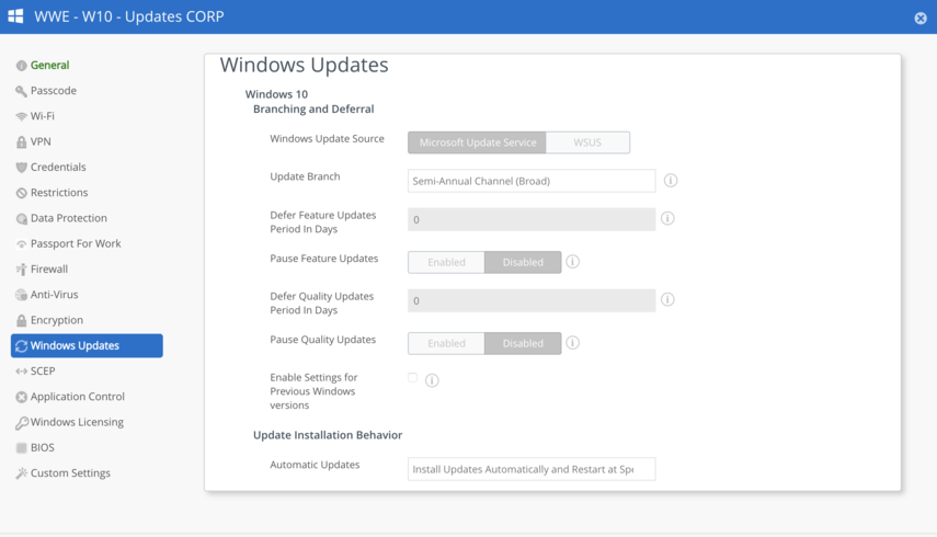 The WWE - Windows - Restrictions Corp profile automatically deploys. Open it to review its payload. This profile contains restrictions for internet sharing, region settings, bluetooth, and Windows Updates (Check the profile's description for the payloads currently configured.).