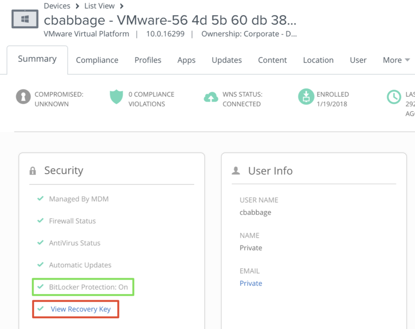 - A Workspace ONE UEM profile encrypts the Windows 10/Windows 11 desktop device via native BitLocker encryption. After disk encryption, the BitLocker encryption key is made available in the Workspace ONE UEM console. If a device is lost and then recovered, with the BitLocker key readily available to the security team in the Workspace ONE UEM console, potentially lost data can be recovered easily.