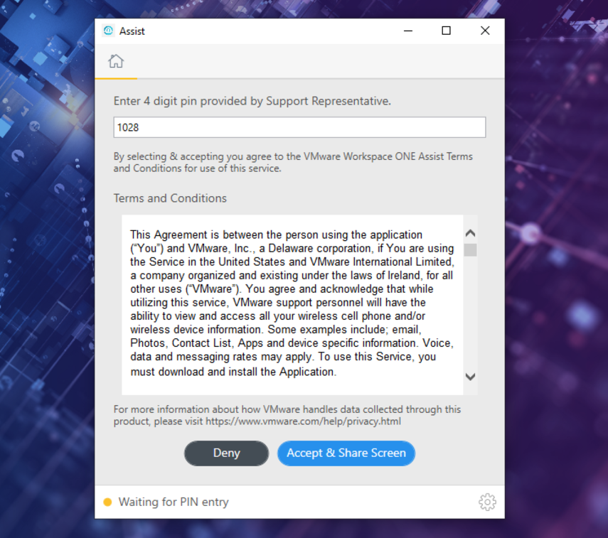 Enter the the support PIN on the device. Accept the Terms and Share Screen.