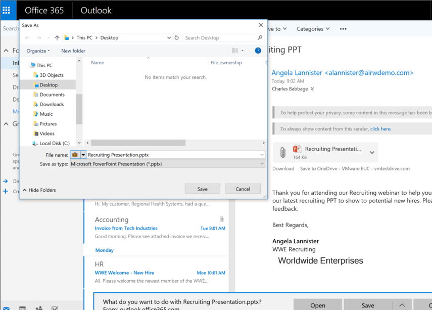 Open an email with an attachment. Download the attachment to your desktop. Note the ability to only save it as a protected work document. Not only is the file under WIP policy, the organization's Office 365 site is too. All of the organization's Office 365 site content is protected and any organizational site can be protected just the same.