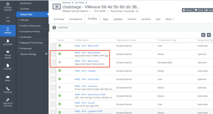 From the Workspace ONE UEM console, in your device's details, push the WWE - Windows - Block Netflix AppLocker profile.