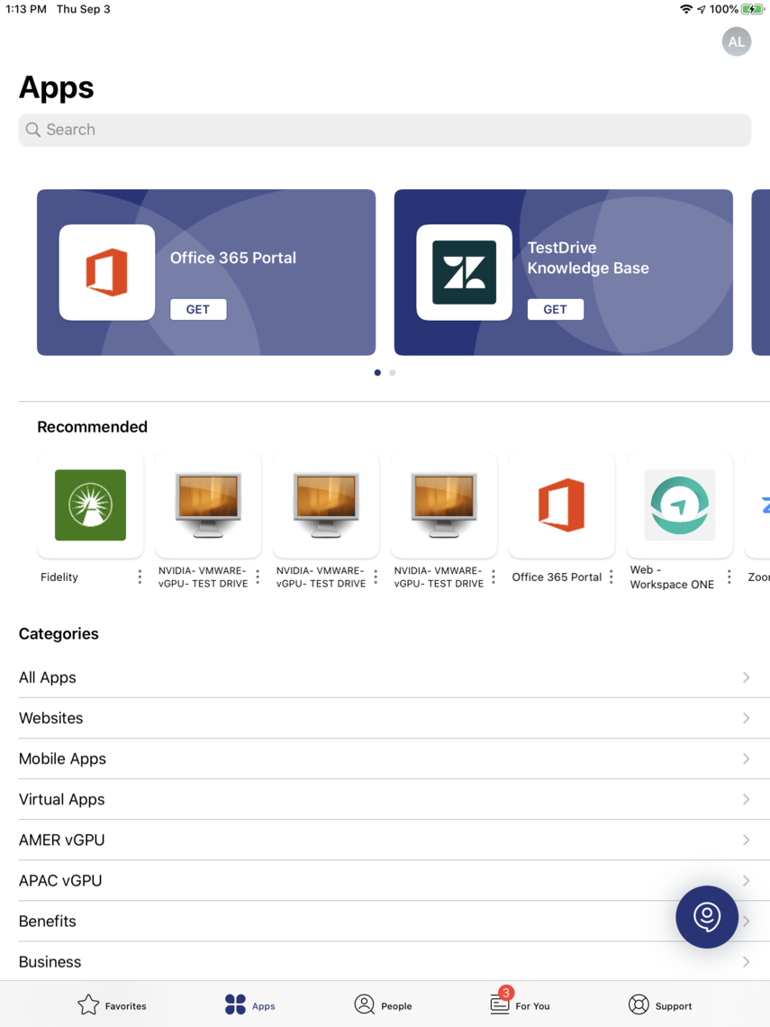 On the Apps screen, all of your organization's apps—mobile apps, web apps, and virtual apps—are presented in various categories. Use the search feature to quickly find a specific app or scroll down through the various groupings to find apps of a specific category.