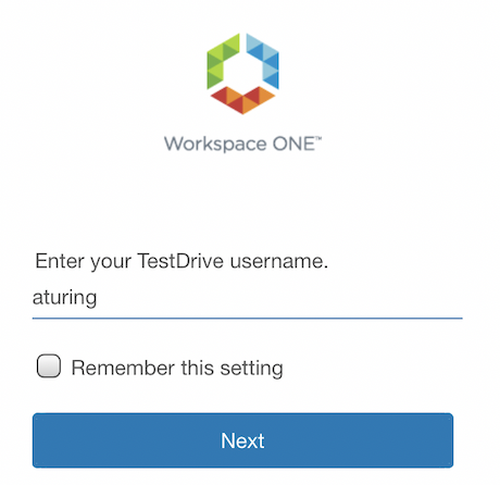 At the Workspace ONE login screens, enter your TestDrive username, then your password. Proceed until done.