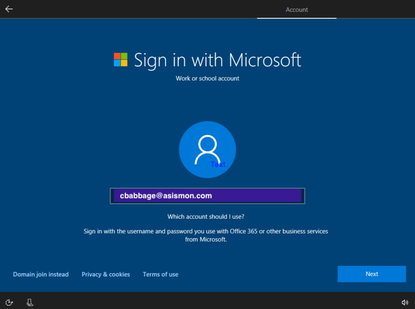 On the Windows 10 PC, on the "sign in with Microsoft" screen, enter the user's organizational email address for Office 365: