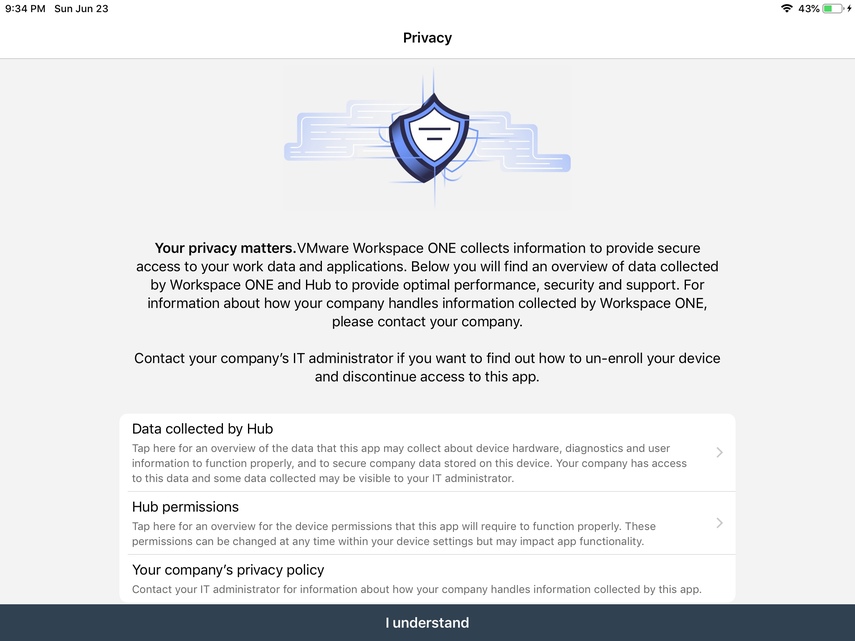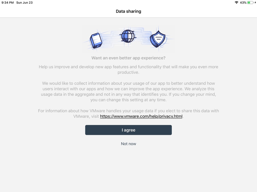 Next, proceed through the Privacy and Data Sharing screens and the Intelligent Hub app will load the unified Apps page.