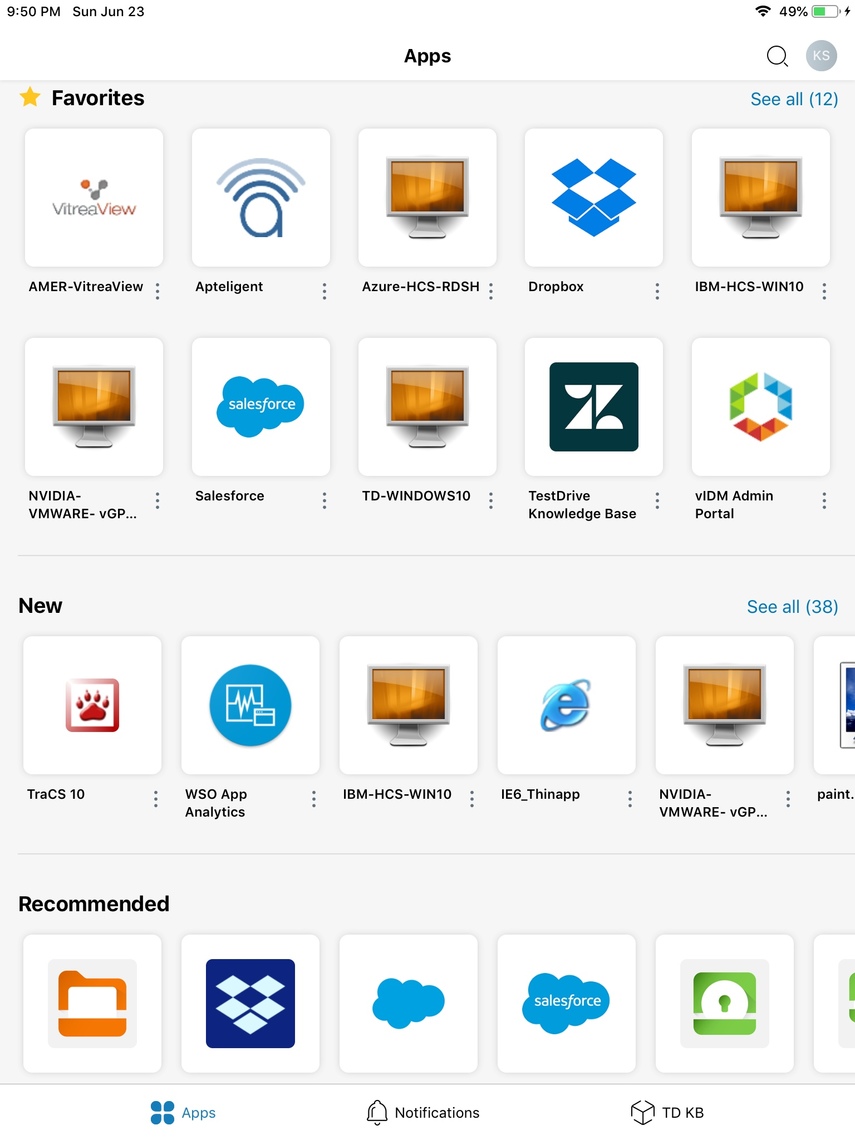 Intelligent Hub aggregates all the apps your employees need whether its a virtual app, web app or native app. All employee marked bookmarks now show under the new Favorites section in the app. There are two other sections viz. 'New' for the latest app additions and 'Recommended' for corporate recommended applications. Users can also search for apps based on Categories as defined by the company. On top of this, Workspace ONE's identity solution is providing single sign on and access policy controls to these apps regardless of what device type, enrollment status or endpoint the user is attempting to access the app from.